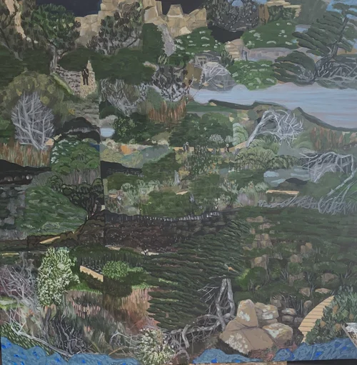 I continue to paint landscapes and they are becoming more exaggerated. Making references to familiar shrub and terrain while pushing colour combinations. I have been layering horizontal patterns, which reminds me of the laying down of sedimentary rock. These familiar views: country that is changing and will continue to change over time and eventually disappear : the loss seems more rapid, the distortion unprepared for while the warnings sound louder.